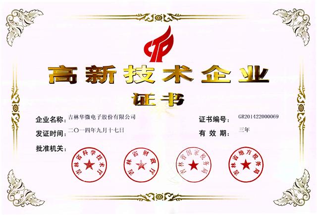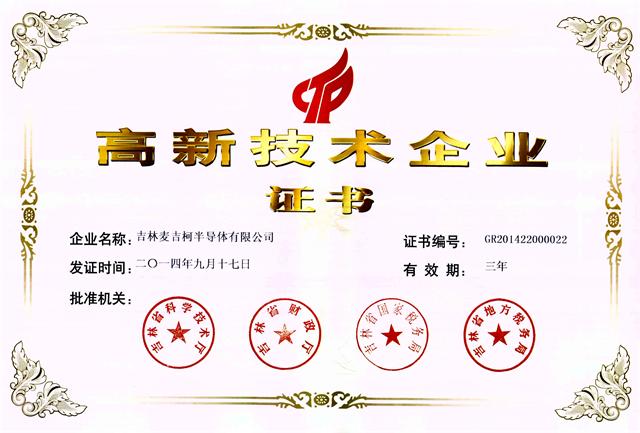 2014年9月吉林麦吉柯半导体有限公司通过高新技术企业认证