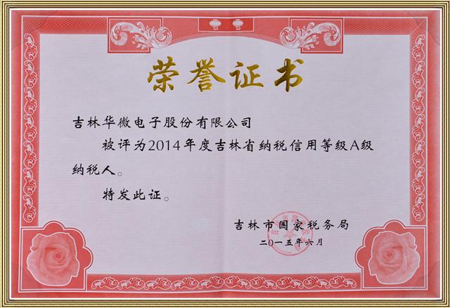 2016年3月16日伟德国际victor·1946源自获得《2014年度吉林省纳税信用等级A级纳税人》荣誉证书。